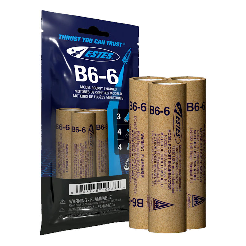 The Estes B6-6 engine is an upper stage engine designed for model rocket flight. This engine can also be used as a single stage engine in lightweight rockets. Each package includes 3 engines, 4 starters and 4 plugs.
