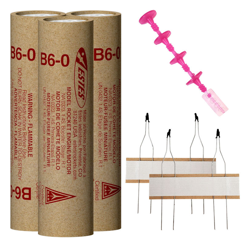 The Estes B6-0 engine is a booster stage engine designed for model rocket flight and has to be used with a standard engine. This engine is for flights in rockets weighing less than 4 ounces, including the engines. Each package includes 3 engines, 4 starters and 4 plugs.