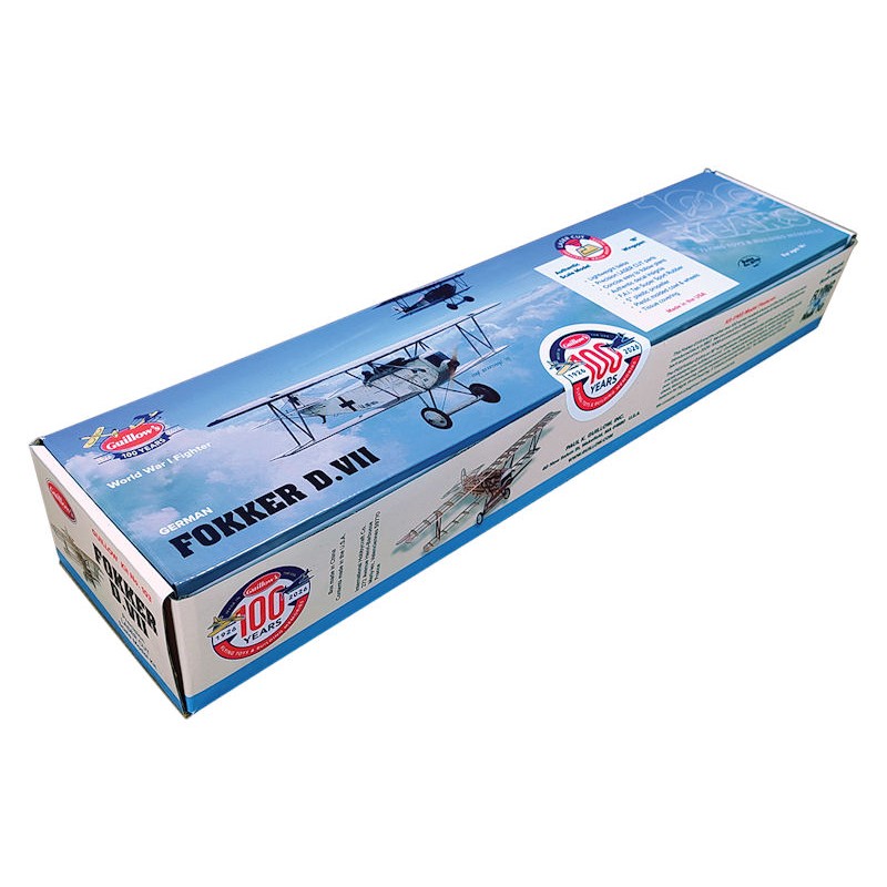 Relive the thrilling era of World War I aviation with Guillow’s Kit #103 Fokker D.VII! This meticulously crafted 1/19 scale balsa wood model features precision LASER-CUT balsa parts for a precise build experience. With a 18-inch wingspan, this kit includes everything you need—detailed building plans / instructions, scale WWI plastic wheels, a full set of decals, vacuum-formed plastic parts, a FAI Tan rubber power motor, propeller, and tissue covering—to create a stunning replica of the legendary fighter flown by German pilots. Perfect for hobbyists aged 14+, whether you’re a detail-obsessed scale display builder or a free-flight enthusiast, this made-in-the-USA kit offers hours of hands-on enjoyment in its building and flying.